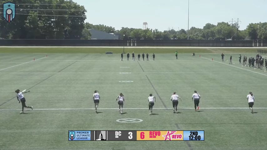 Here's an example of someone who seems to be roughly using the technique I'm suggesting. It's from another Portland Rising vs. NY Gridlock game, in 2024. Watch how the Gridlock player gets all the way to the sideline to read the pull: