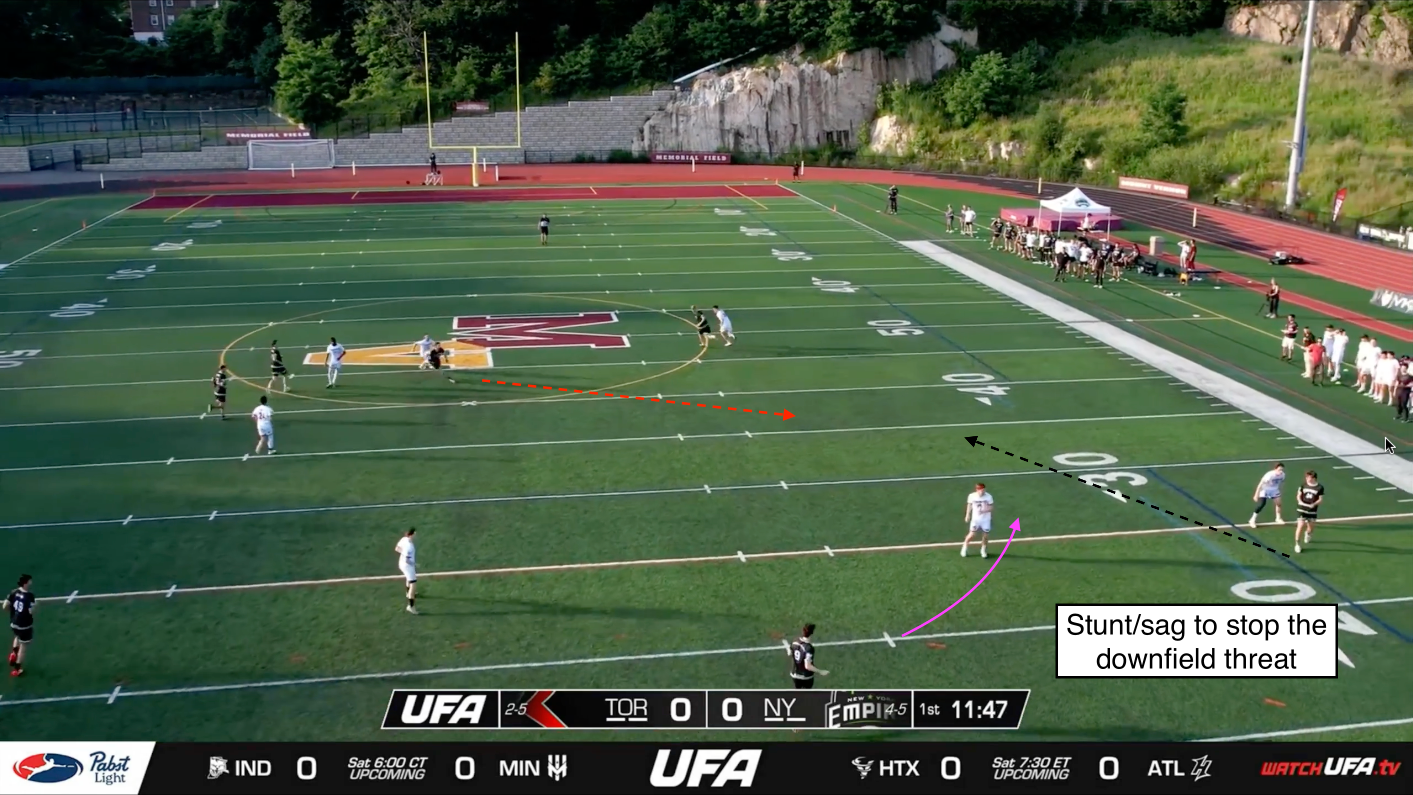 It’s also common to see stunt-and-recover tactics in zone defenses, where one defender wants to convince the thrower they’re close enough to threaten D’s on multiple receivers. Similarly, playing on the “wing” of an endzone defense in the UFA is another common spot to use stunts, as we saw in some examples from The art of beating the help defense back to the second option. Here’s another clip I found of endzone wing defender help and recover: