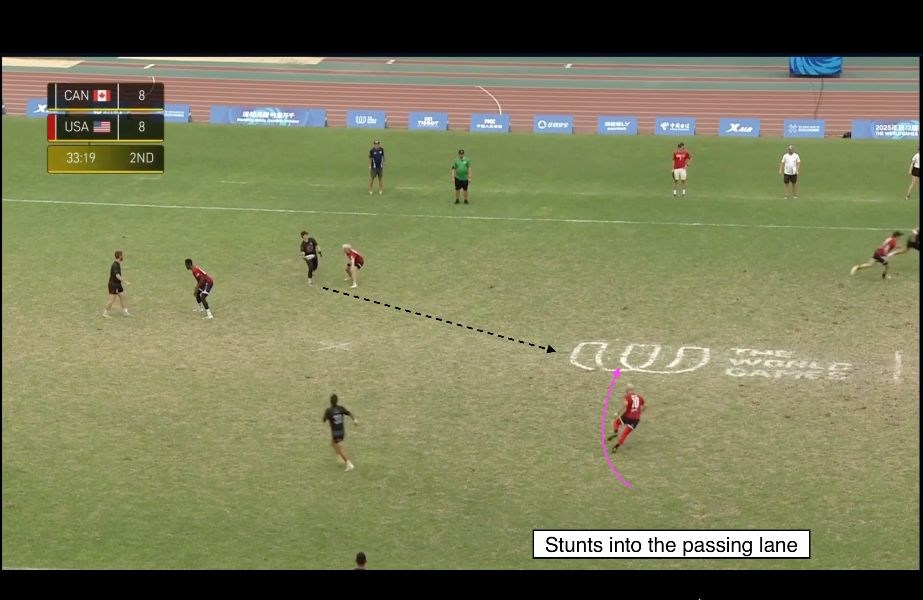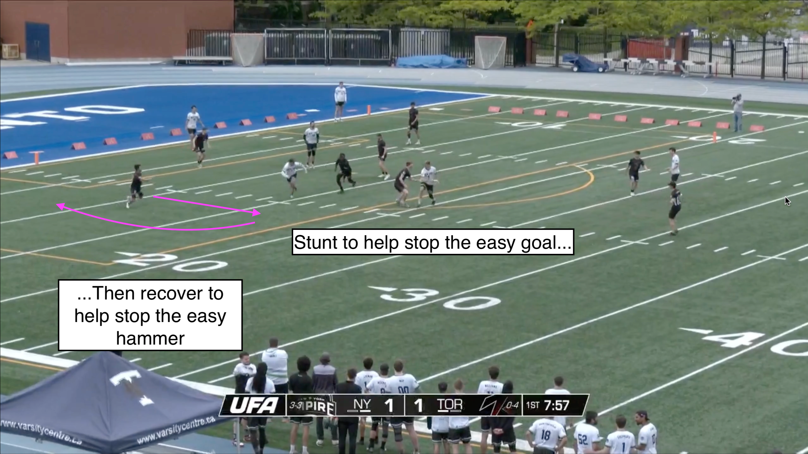 So we try to get the best of both worlds—when the thrower is looking past us downfield, we attack into that passing lane to discourage the pass, i.e. we stunt towards the lane. But then once we’ve done that, we recover back towards the person we were originally guarding, so the thrower doesn’t have an easy pass there, either. Done well, one defender can help shut down multiple options near simultaneously.