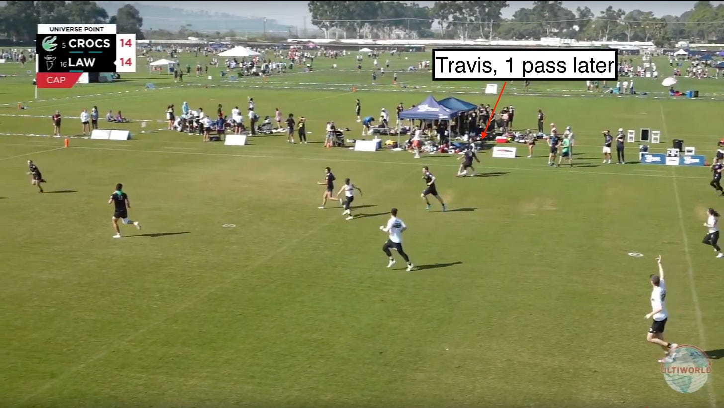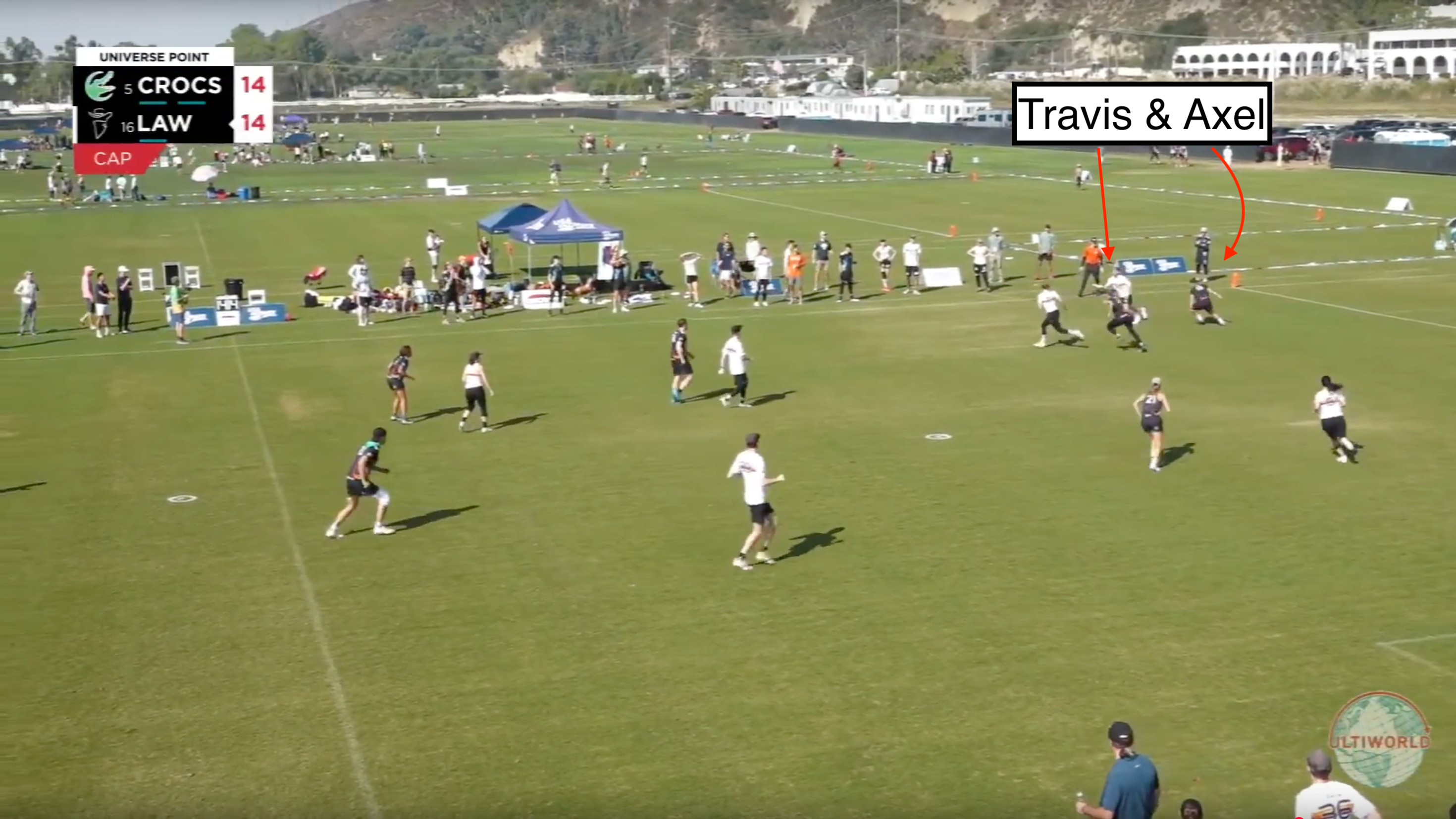 Let’s look at a couple cutter defenders now. On universe point in pool play at 2023 US Nationals, Axel Agami Contreras goes for the run through block on a swing pass to Travis Dunn. He *just* misses and ends up maybe two yards behind Travis. But Dunn reacts quickly, getting rid of the disc and cutting upline before Agami Contreras can get back in position.
