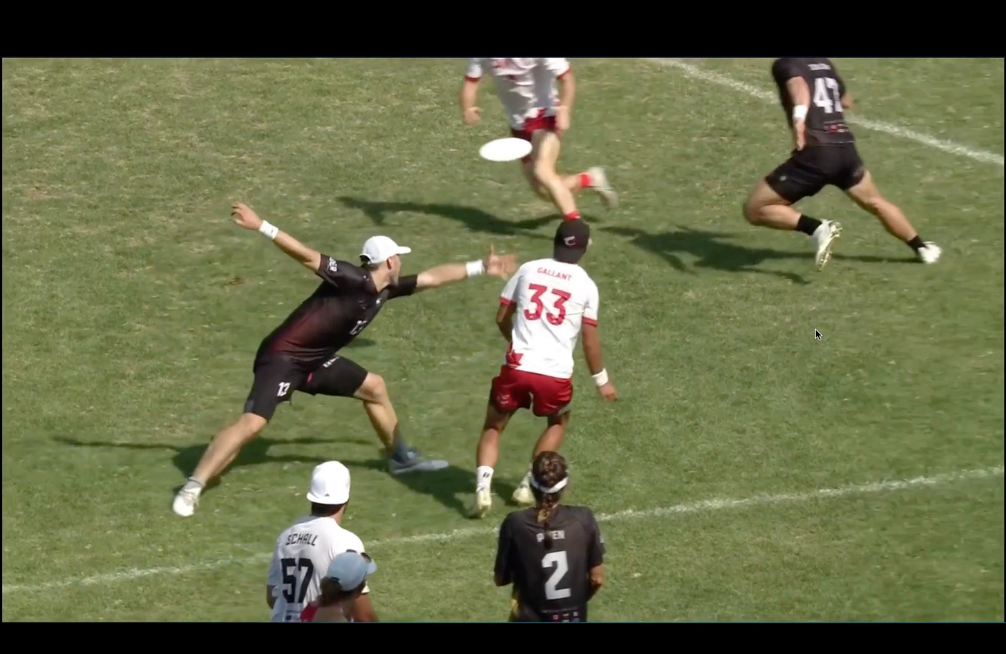 Of course, I’m not saying these mistakes are the only reason the defense gave up the score in each clip. Marty Gallant was less than 10 yards from the endzone when he caught his defender reaching—Team Canada probably had a 90% chance of scoring anyway, so this error was worth 0.1 points, at most. Lawless was ~65 yards from the endzone when Agami Contreras overran the swing pass, and Lawless still hadn’t scored when he caught back up, so it may have been a 0.25-0.35 point error (assuming a baseline hold percentage of about 60% and a 85-95% chance to score from Lawless’s position after the mistake).